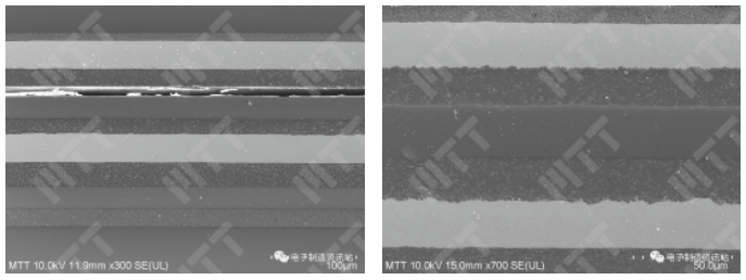 失效FPC鼓包位置切片后,均发现界面分离现象,分离位于粘合剂与PI膜之间;OK FPC切片后均未发现界面分层现象。