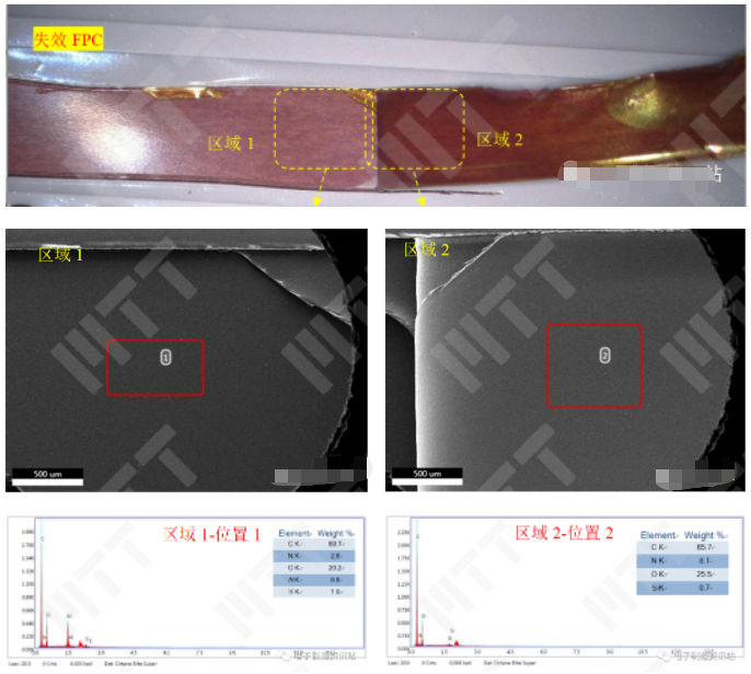 失效FPC:分离界面位于PI膜与粘合剂之间,与剖面观察结果一致;分离界面光滑,未见明显粘结特征;分离界面未见明显异物残留痕迹,粘合剂侧探测到C、N、O、Al、S元素,PI膜侧探测到C、N、O、Si元素。