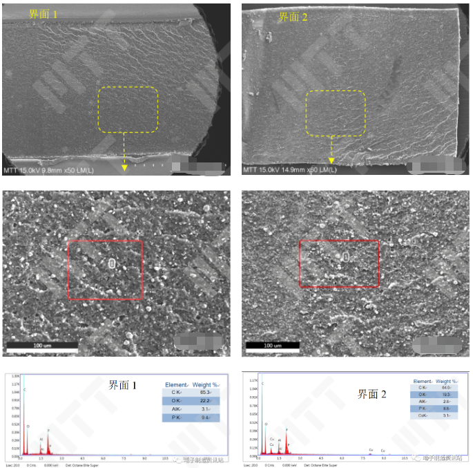 图3. OK FPC半成品机械剥离后分离界面形貌观察及成分分析结果
