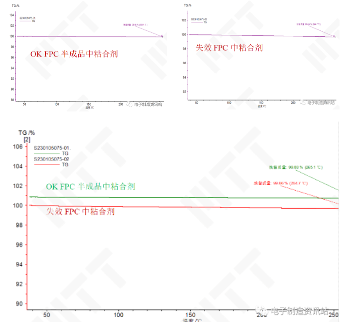 结果显示,失效FPC中粘合剂剩余质量较OK FPC半成品粘合剂偏低,说明失效FPC产品加热过程中确实存在气体放出现象。