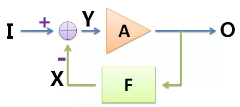方框F是反馈器件,表示从输出O取出信号,并将其与F相乘,得到 X ,所以 X=0*F ,这里 F<1 (这个部分在实际电路中可以用电阻实现);